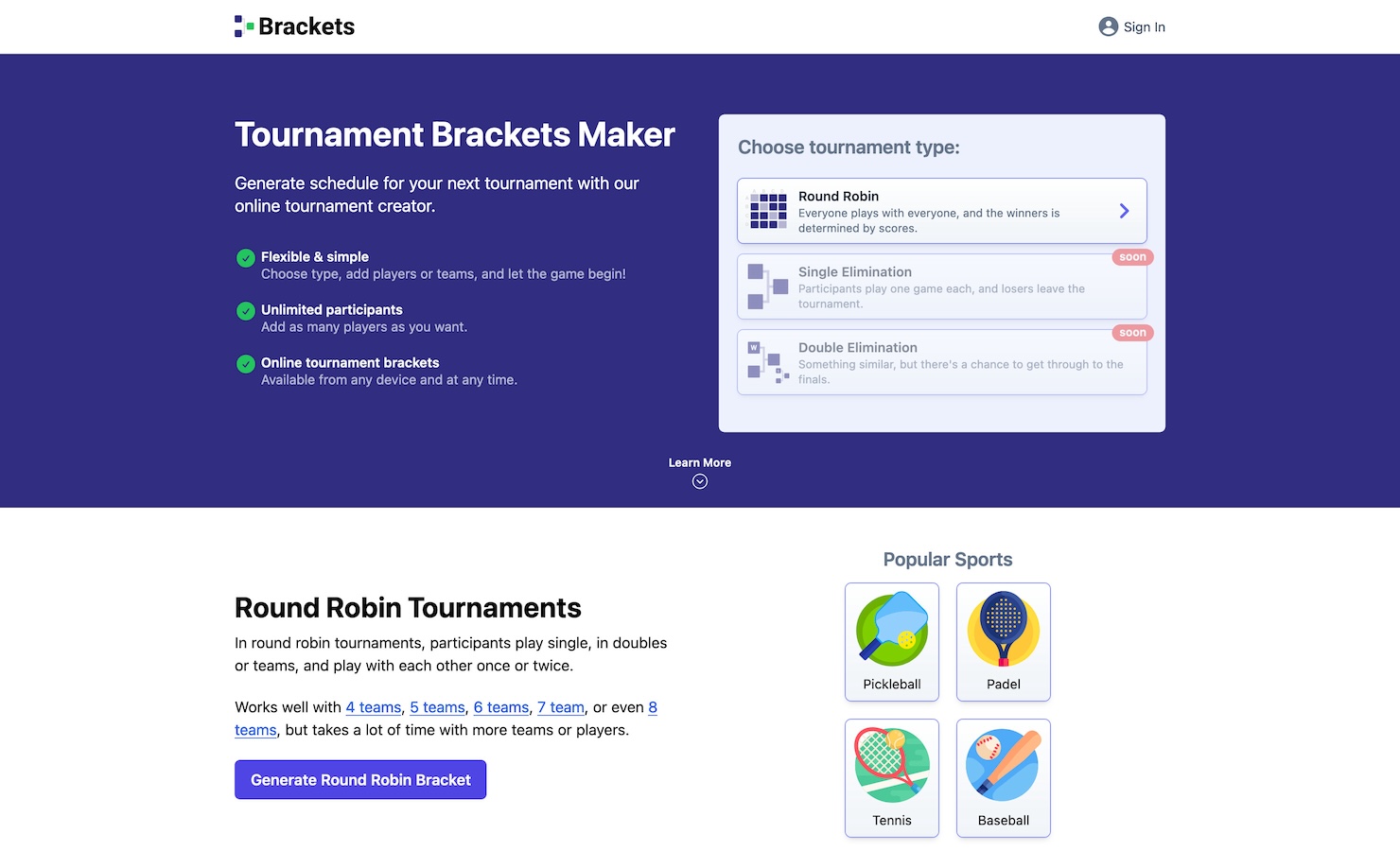 Brackets.app revolutionizes tournament management, allowing anyone to generate and customize tournament brackets with ease. Effortlessly invite players and manage the entire event online, from initial setup to the final match. The app simplifies score entry and automatically calculates and updates leaderboards and standings in real-time, ensuring everyone stays informed. Its intuitive interface is designed for both casual and professional organizers, providing a smooth, user-friendly experience. Brackets.app is the perfect tool for any competition, combining convenience and efficiency to simplify your tournament organization needs. Say goodbye to manual bracket management and embrace the future with Brackets.app