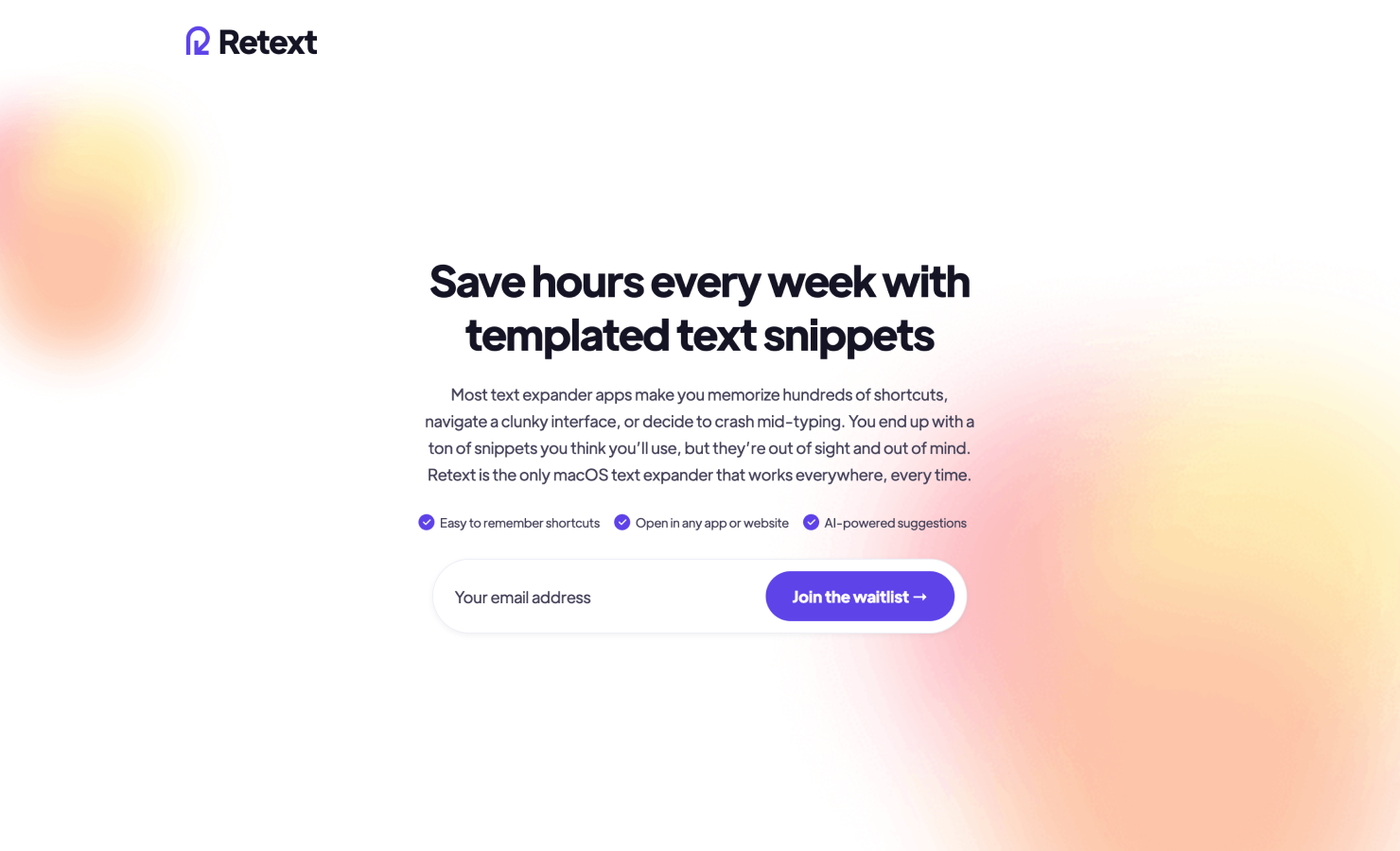 Retext is a macOS app to use text snippets across any app or browser. Most text expander apps make you memorize hundreds of shortcuts, navigate a clunky interface, or decide to crash mid-typing. You end up with a ton of snippets you think you’ll use, but they’re out of sight and out of mind. Retext is the only macOS text expander that works everywhere, every time. Key Features - macOS native app: Seamlessly integrates into macOS for optimal speed and compatibility. - Universal compatibility: Works across all applications and browsers on your Mac. - Smart shortcut suggestions: AI-powered suggestions eliminate the need to memorize snippet shortcuts. - Snippet organization: Automatically organizes and categorizes snippets using tags for quick navigation. Benefits - Saves hours weekly: Retext optimizes workflow by reducing repetitive typing, saving users hours each week that would otherwise be spent retyping or searching for responses. - Enhanced productivity across tasks: Easily access common snippets for tasks like AI prompting, customer support replies, email responses, and sales conversations, ensuring fast, accurate communication. - Stress-free snippet recall: With intuitive shortcut suggestions, Retext eliminates the mental effort of memorizing commands, letting users focus on conversations and content creation. Use Case For anyone who often types similar responses or phrases, Retext enables consistent, quick access to snippets without memorizing or navigating through multiple apps — ideal for professionals handling repetitive emails, customer support responses, or AI prompts.