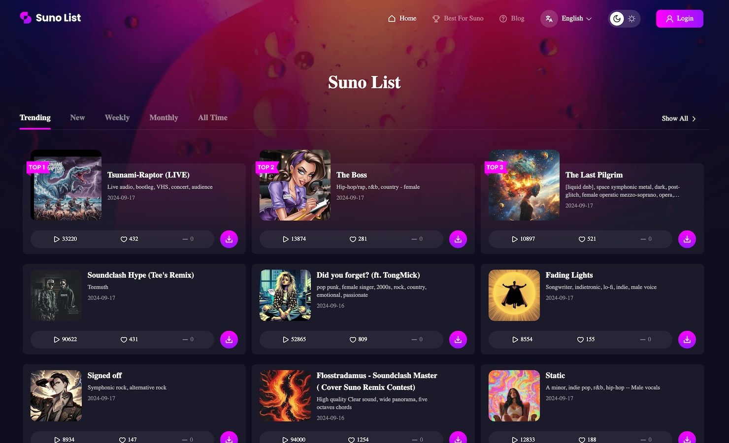 Suno List is a platform that provides AI-generated music charts, offering users the latest trending songs and artists. The site features personalized music recommendations, detailed data analysis, and insights into the technology behind AI music charting. It offers a user-friendly experience with step-by-step guides to navigate its features and provides regular updates of top AI tracks. The website supports multiple languages and is designed for music enthusiasts looking to stay updated with AI-driven music trends.