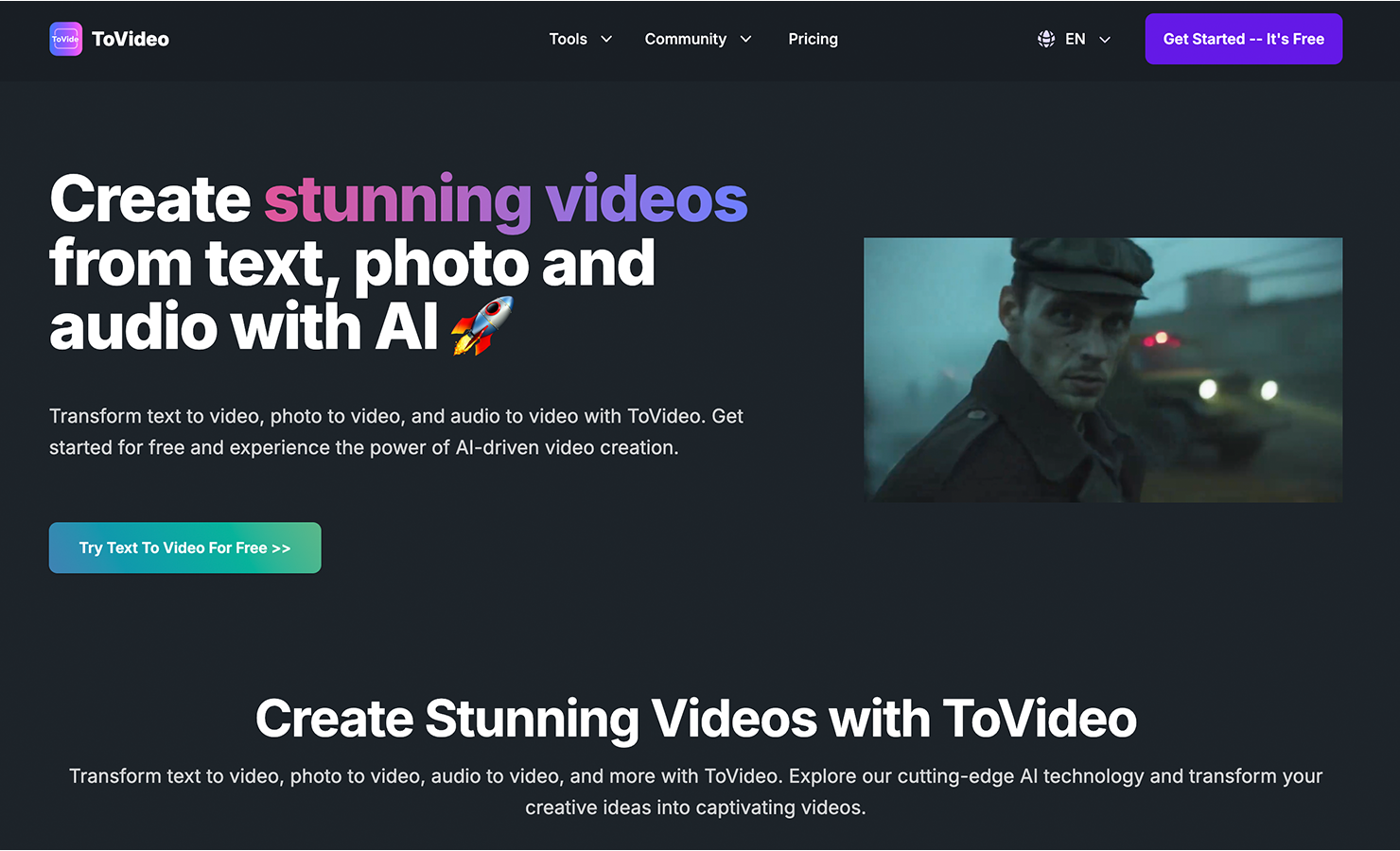 Turn image to video with ToVideo. Our free photo to video converter offers AI tools, editing features, and high-quality MP4 downloads.