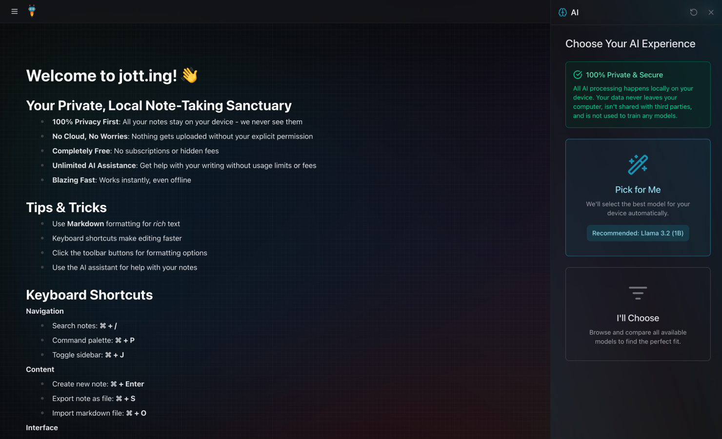 jott.ing is a private, offline note-taking app with free AI features. Keep your notes secure and local on your device. Key Features - Complete Privacy: Your notes stay local on your device, with no cloud storage or data sharing risks. - Offline Access: Works fully offline as a PWA, letting you take notes anywhere without an internet connection. - Free AI Tools: Unlimited AI features like auto-tagging and summarizing enhance your notes at no cost. - Local AI Processing: AI runs on your device, keeping your data secure and private. - Easy Installation: Installs as a PWA in seconds, offering an app-like experience on any device. - Note Summaries: Get concise summaries of long notes instantly with built-in AI. - Creative Prompts: Generate ideas or prompts from your notes to spark inspiration. - No Subscriptions: Enjoy all features for free, with no hidden fees or paywalls. - Lightweight Design: A fast, simple interface that won’t slow down your device. Benefits - Total Data Control: Keep your notes private and secure, with no risk of leaks or third-party access. - Work Anywhere: Use the app offline, perfect for travel, remote areas, or when connectivity is unreliable. - Enhanced Productivity: Free AI tools organize and summarize your notes, saving you time and effort. - Cost-Free Experience: Access powerful features without spending a dime, unlike premium apps. - Seamless Access: Install it on any device as a PWA, no app store or complex setup needed. Use Case - Personal Journaling: Write private thoughts offline, keeping them secure and local on your device. - Student Note-Taking: Capture lecture notes and use AI to summarize or tag them for easy studying. - Travel Planning: Jot down itineraries and ideas without internet, perfect for on-the-go travelers. - Creative Writing: Store story ideas and generate prompts with AI to overcome writer’s block. - Professional Meetings: Record meeting notes offline and let AI organize them for quick follow-ups. - Research Collection: Save research snippets locally and summarize them with AI for efficient analysis. - Daily To-Do Lists: Create tasks anywhere, with tags auto-applied for better task management. - Sensitive Data Logging: Log confidential info like passwords or plans with no cloud exposure. - Brainstorming Sessions: Write ideas freely and use AI to refine or expand them later. - Offline Productivity: Stay productive in low-signal areas with a fully functional note app.